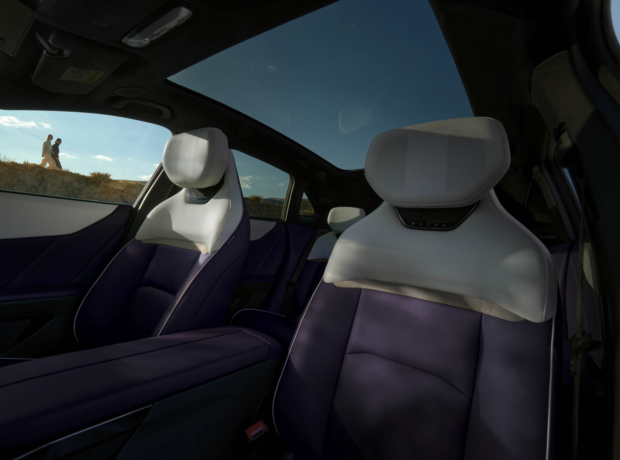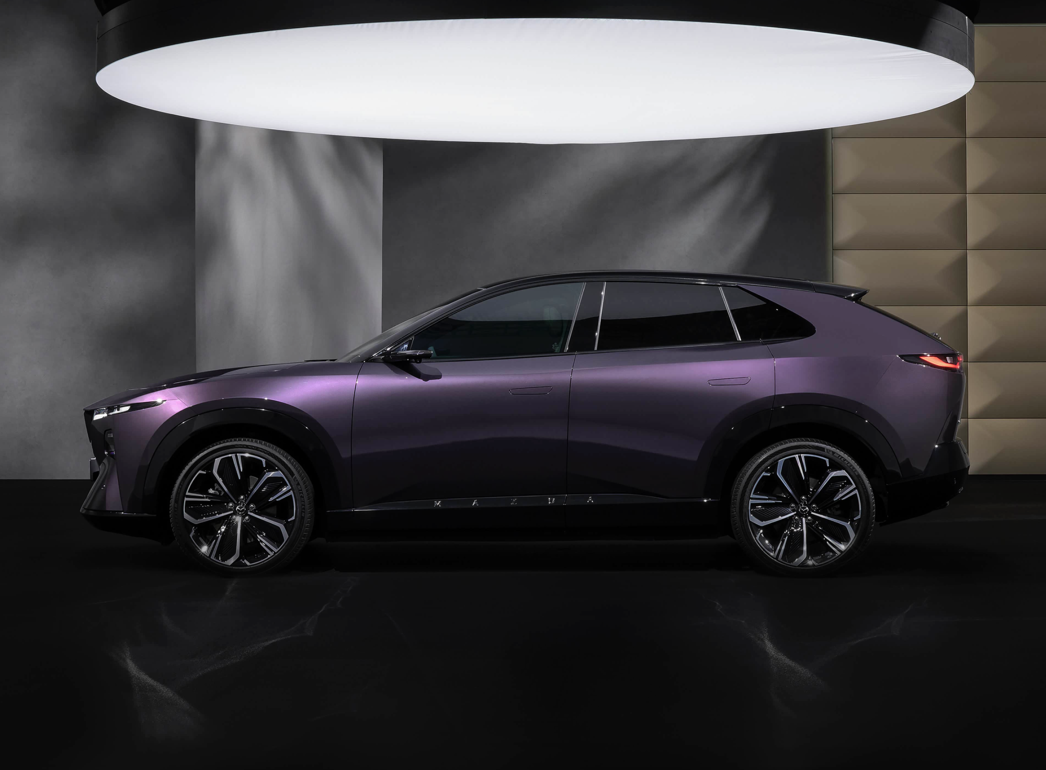 马自达CX-6e的车身采用了轿跑式轮廓,倾斜的黑色A柱与弧线形的车顶一气呵成,并与黑色加宽的B柱/C柱、黑色的车窗装饰边框巧妙地融为一体,形成了悬浮式车顶的立体效果。车身加入了灵动、妖娆的腰线设计,四个隐藏式的门把手和四个无边框车门的加入,黑色宽大的侧裙与前后拱形的轮眉连接在一起,还配备了21英寸的多辐式锻造轮圈,匹配了255/40 R21米其林竞驰4 SUV轮胎,内置红色制动卡钳罩,还配备了硕大的黑色倒车镜外壳。整车更加激进、运动。车身尺寸方面,马自达CX-6e长宽高分别为4850/1935/1620毫米,轴距2902毫米,车内采用了标准的5座布局。